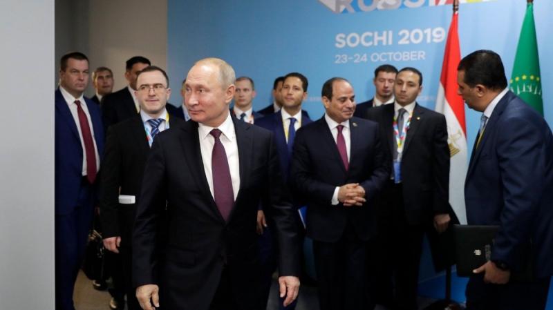 Владимир Путин и Президент Арабской Республики Египет, Председатель Африканского союза, сопредседатель саммита Россия – Африка Абдельфаттах Сиси приняли участие в пленарном заседании экономического форума Россия – Африка.